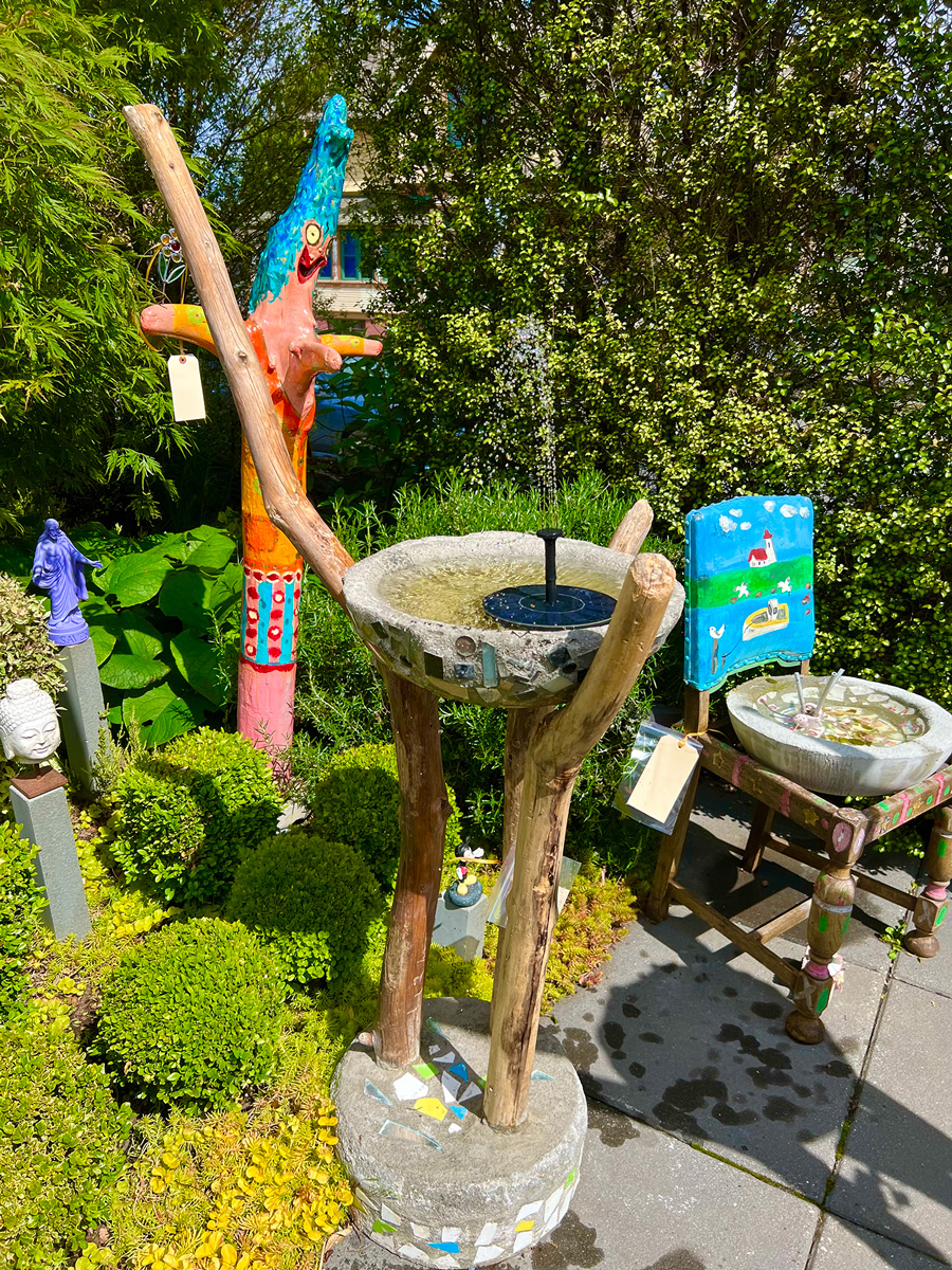 Whimsical garden art, upcycle driftwood & cement bird & bee bath.