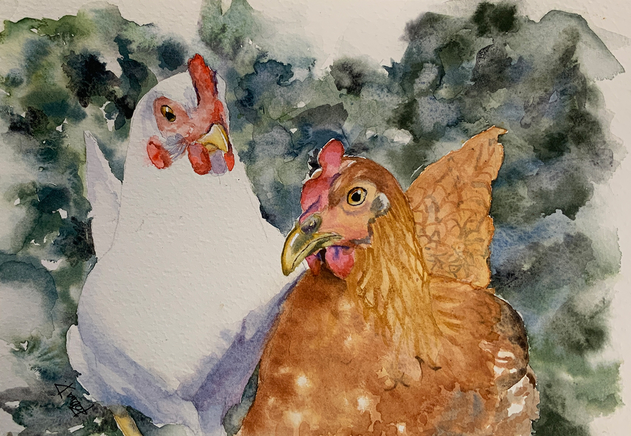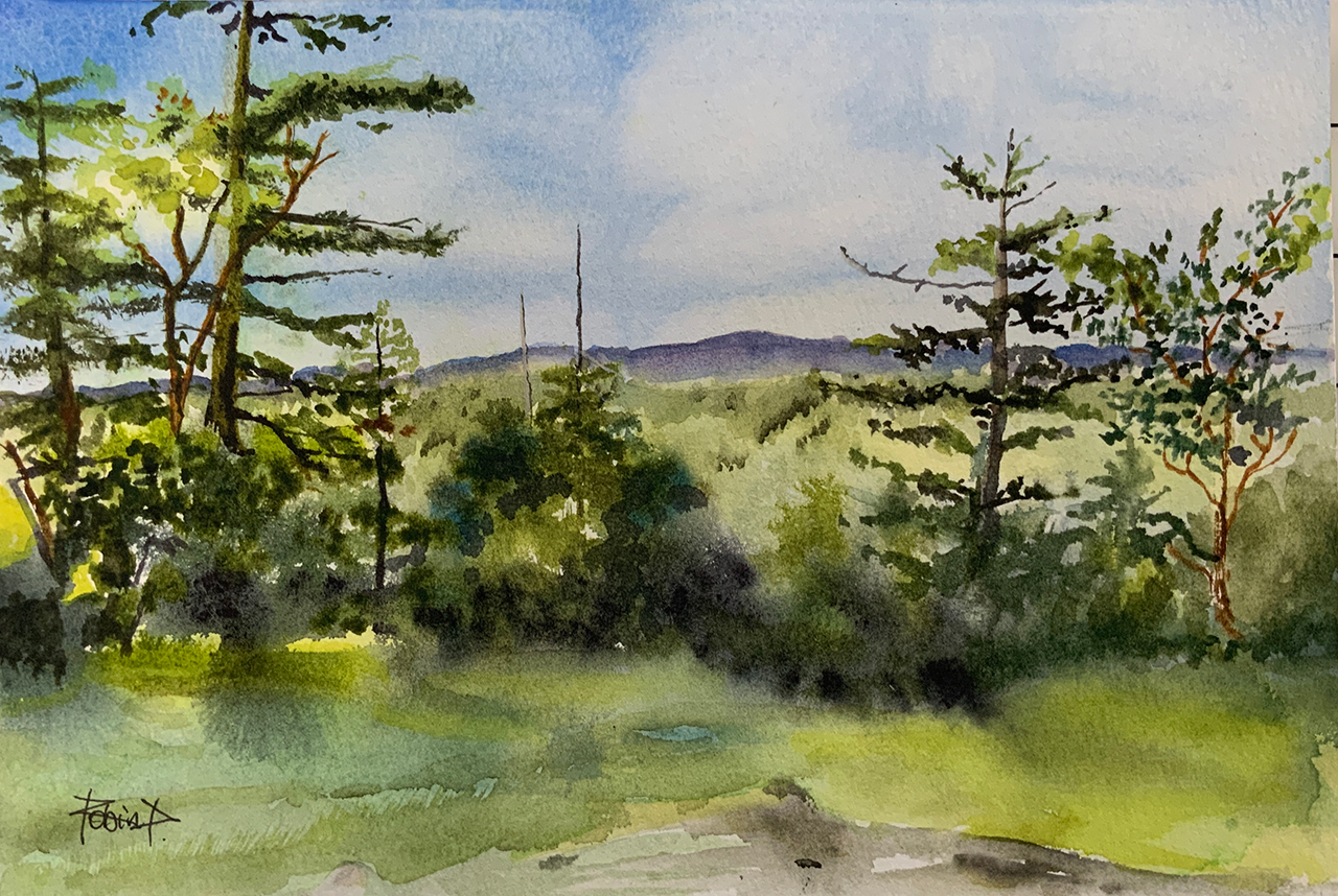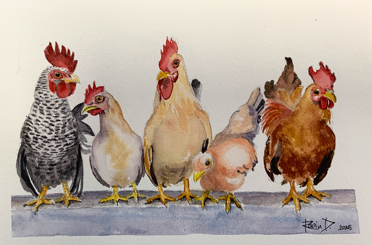 Robin is excited by colours and the effect of light on shapes; the feel of paint flowing from the brush; and the fascinating ways our eyes and minds see 3-dimensions on the flat surface of a painting. She creates art for pure enjoyment and takes commission work when it presents. She loves to paint nature, pets and people as well as caricatures of people. Watercolour on paper is her most-used medium, but acrylics, oils, and house paints are also used, on various mediums including shoes and furniture.